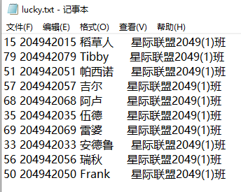 #include<stdio.h> #include<string.h> #include<time.h> #include<stdlib.h> #define _CRT_SECURE_NO_WARNINGS #pragma warning( disable : 4996) #define N 80 typedef struct { int num; long int id; char name[20]; char room[20]; int judge ; }STU; void select(STU[], int, int); int main() { STU stu[N] = { 0 }; FILE* fp; int sum = 0; while (scanf("%d", &sum) != EOF) { if (sum == 0)break; fp = fopen("C:\\Users\\sf200\\Desktop\\FILE\\程序设计作业\\实验\\实验七\\option\\list.txt", "r"); for (int i = 0; i < N; i++) { stu[i].judge = 0; fscanf(fp, "%d %ld %s %s", &stu[i].num, &stu[i].id, stu[i].name, stu[i].room); } select(stu, N, sum); fclose(fp); } return 0; } void select(STU s[N],int n,int sum) { int z = 0; FILE* fin; fin = fopen("C:\\Users\\sf200\\Desktop\\FILE\\程序设计作业\\实验\\实验七\\option\\lucky.txt", "w"); srand((unsigned int)time(NULL)); for (int i = 0; i < sum; i++) { z = rand() % n; if (s[z].judge == 0) { s[z].judge = 1; } else { i--; continue; } printf("%2d %5ld %-10s %-15s\n", s[z].num, s[z].id, s[z].name, s[z].room); fprintf(fin, "%2d %5ld %-10s %-15s\n", s[z].num, s[z].id, s[z].name, s[z].room); } fclose(fin); }