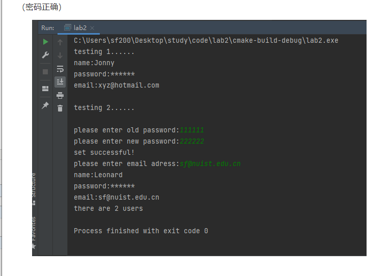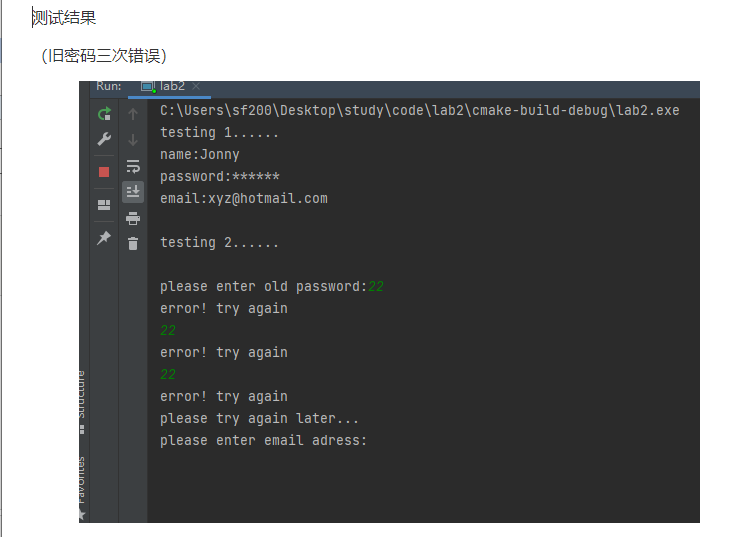 //User.h #ifndef LAB2_USER_H #define LAB2_USER_H #include "iostream" #include "string" using namespace std; class User { public: User(string n = "", string p = "111111", string e = "") { name = n; password = p; email = e; count++; } ~User() {}; void set_email() { string temp; cout << "please enter email adress:"; cin >> temp; email = temp; } void change_passwd() { cout << "please enter old password:"; int flag = 0; string temp; while (1) { if (flag == 3) { cout << "please try again later..." << endl; return; } cin >> temp; if (temp == password) { break; } else { cout << "error! try again" << endl; flag++; } } cout << "please enter new password:"; cin >> temp; email = temp; cout << "set successful!" << endl; } void print_info() { cout << "name:" << name << endl; cout << "password:******" << endl; cout << "email:" << email << endl; } static void print_n(); private: string name; string password; string email; static int count; }; #endif //LAB2_USER_H