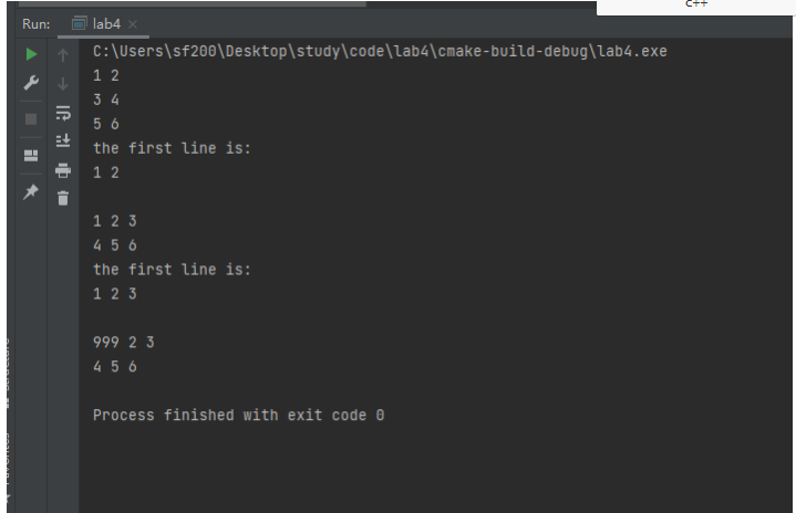 //task.cpp #include <iostream> #include "Matrixx.h" int main() { using namespace std; double x[] = {1, 2, 3, 4, 5, 6}; Matrix m1(3, 2); // 创建一个3×2的矩阵 m1.set(x); // 用一维数组x的值按行为矩阵m1赋值 m1.print(); // 打印矩阵m1的值 cout << "the first line is: " << endl; cout << m1.at(0, 0) << " " << m1.at(0, 1) << endl; cout << endl; Matrix m2(2, 3); m2.set(x); m2.print(); cout << "the first line is: " << endl; cout << m2.at(0, 0) << " " << m2.at(0, 1) << " " << m2.at(0, 2) << endl; cout << endl; Matrix m3(m2); m3.set(0, 0, 999); m3.print(); }