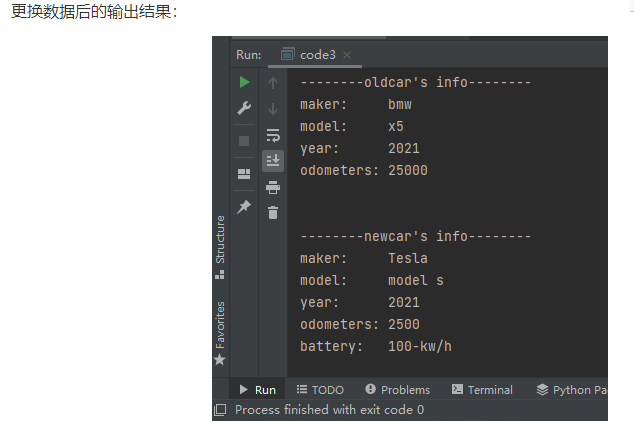 //task3.cpp #include <iostream> #include "ElectricCar.h" int main() { using namespace std; // test class of Car Car oldcar("Audi", "a4", 2016); cout << "--------oldcar's info--------" << endl; oldcar.update_odometers(25000); oldcar.info(); cout << endl; // test class of ElectricCar ElectricCar newcar("Tesla", "model s", 2016); newcar.update_odometers(2500); cout << "\n--------newcar's info--------\n"; newcar.info(); }