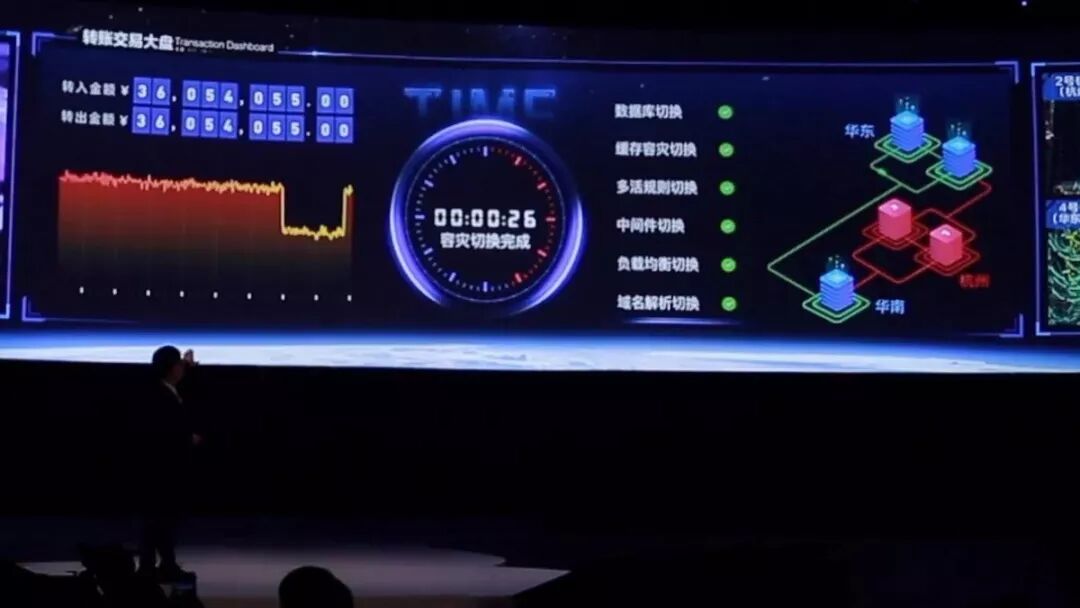 经过几年的卧薪尝胆,时间来到 2018 年 9 月。云栖大会上,蚂蚁金服发布了“三地五中心金融级高可用方案”。现场部署了一个模拟转账系统,在场观众通过小程序互相不断转账。服务端分布在三个城市的五个数据中心,为了感受更直观,把杭州其中一个数据中心机柜设置在了会场。工作人员当场把杭州两个数据中心的网线剪断,来模拟杭州的城市级灾难。