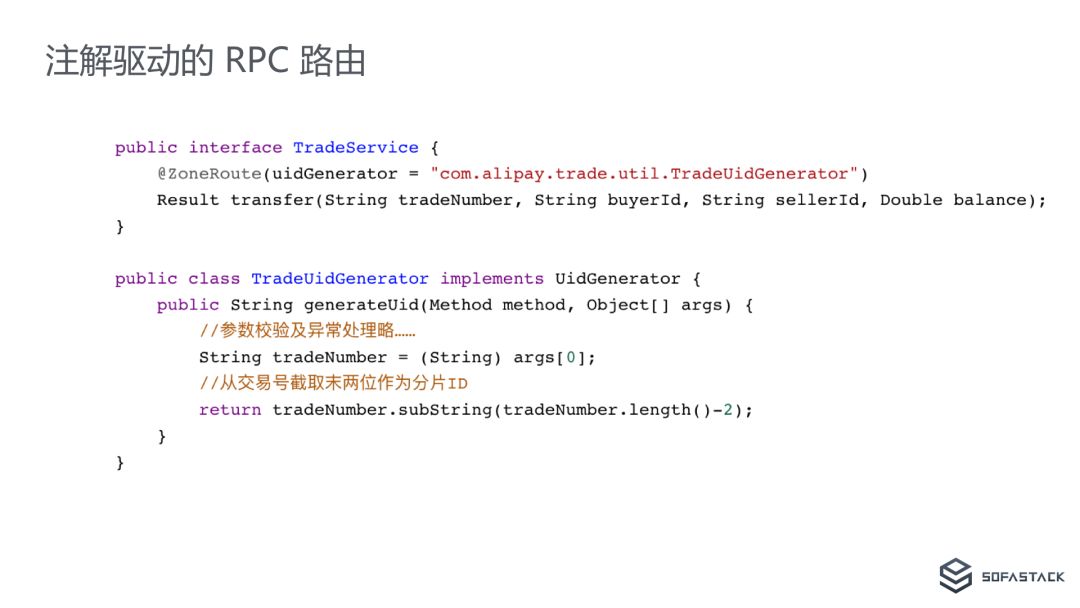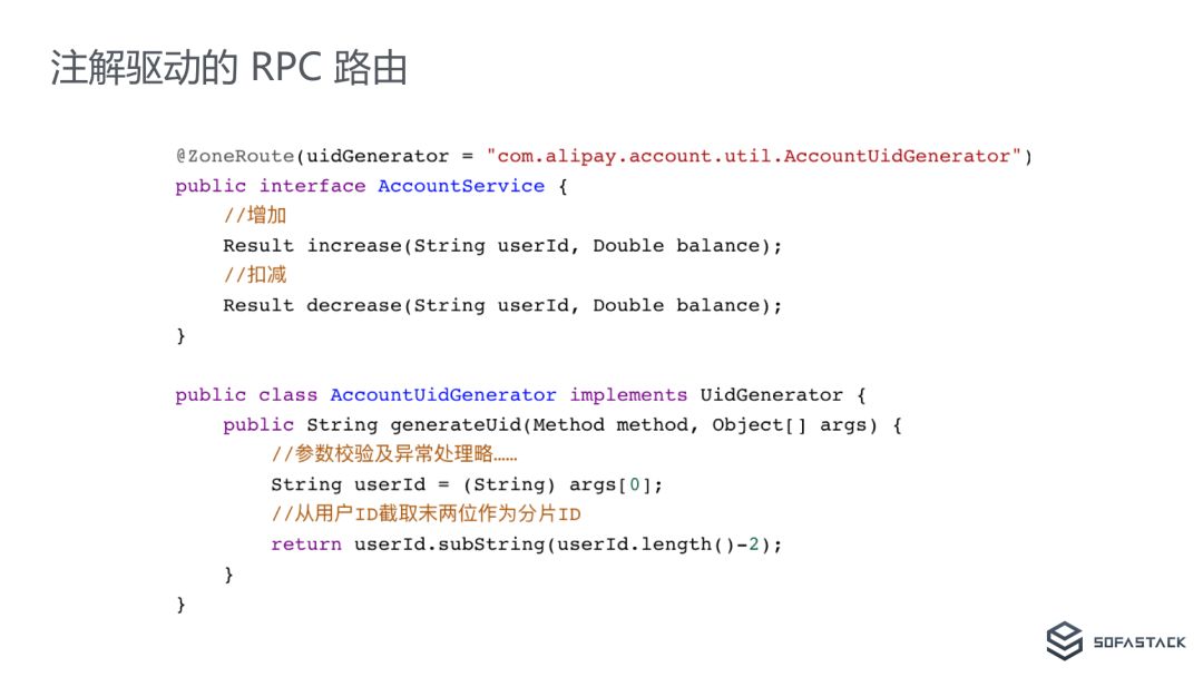 于是我们的解决方案是框架定义一个接口,由服务提供方给出一个实现类,描述如何从业务参数中获取分片 ID。服务提供方在接口上打注解,告诉框架实现类的路径。框架就可以在执行 RPC 调用的时候,根据注解的实现,从参数中截出分片 ID。再结合全局路由规则中分片 ID 与逻辑单元之间的映射关系,就知道该选择哪个单元的服务提供方了。