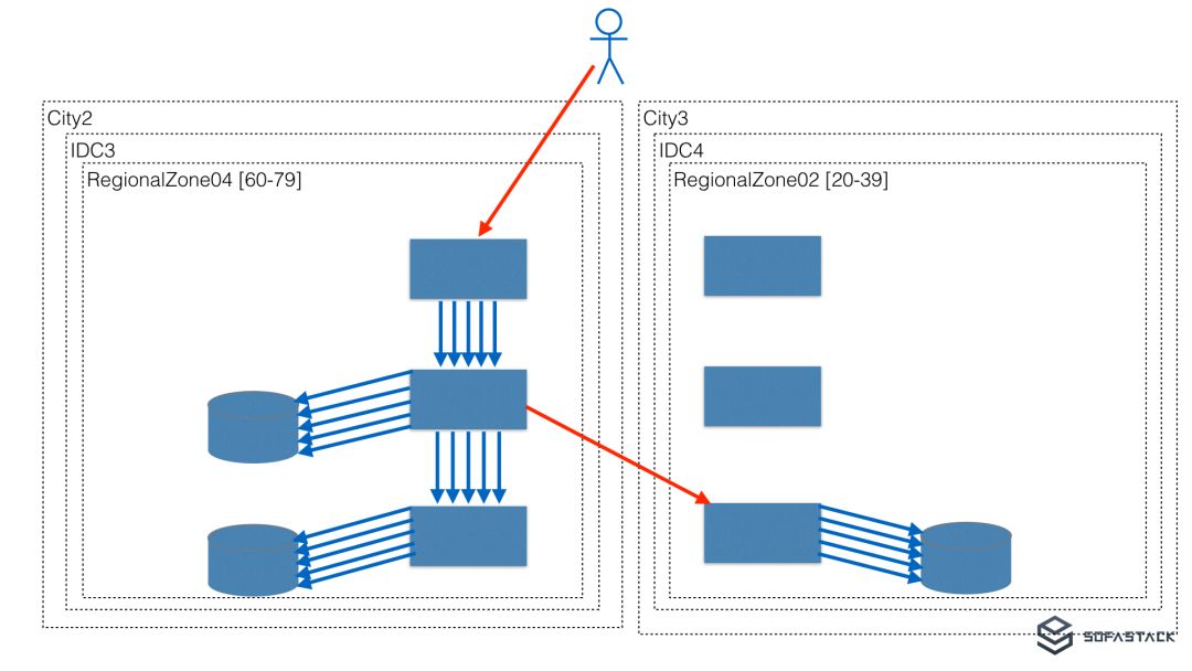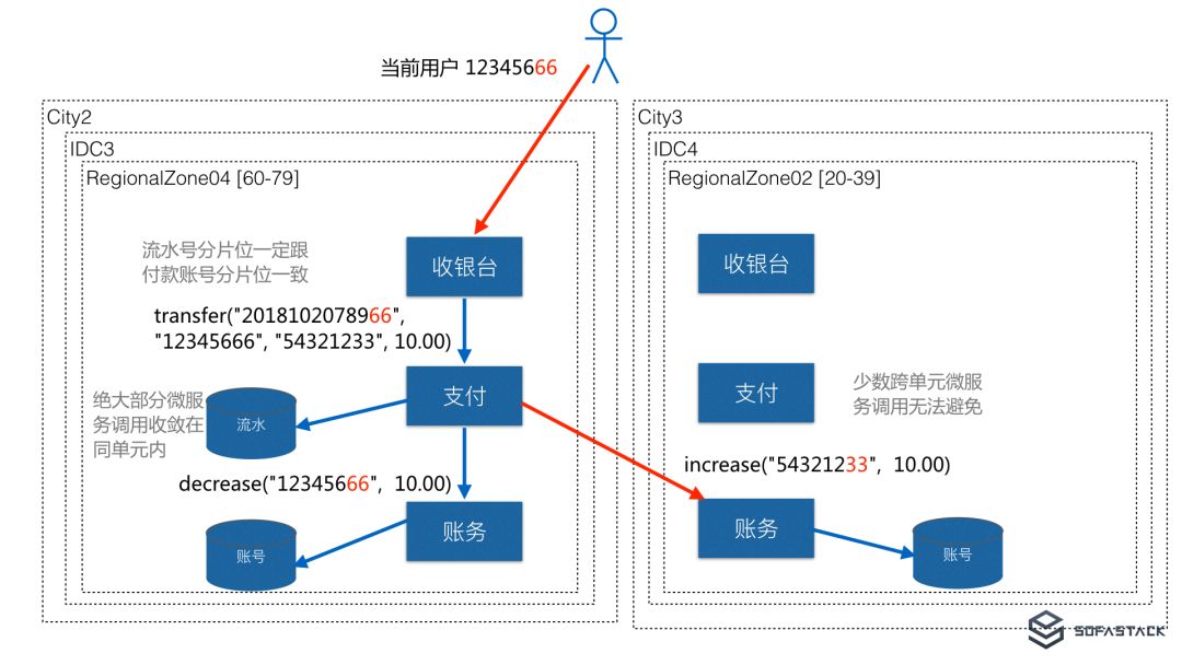 但是转账操作一定会涉及到两个账户,很可能位于不同的单元。张大妈的账号就刚好位于另一个城市的 Regional Zone 02。当支付系统调用账务系统给张大妈的账号加钱的时候,就必须跨单元调用 Regional Zone 02 的账务服务。图中用红线表示耗时很长(几十毫秒级)的异地访问。