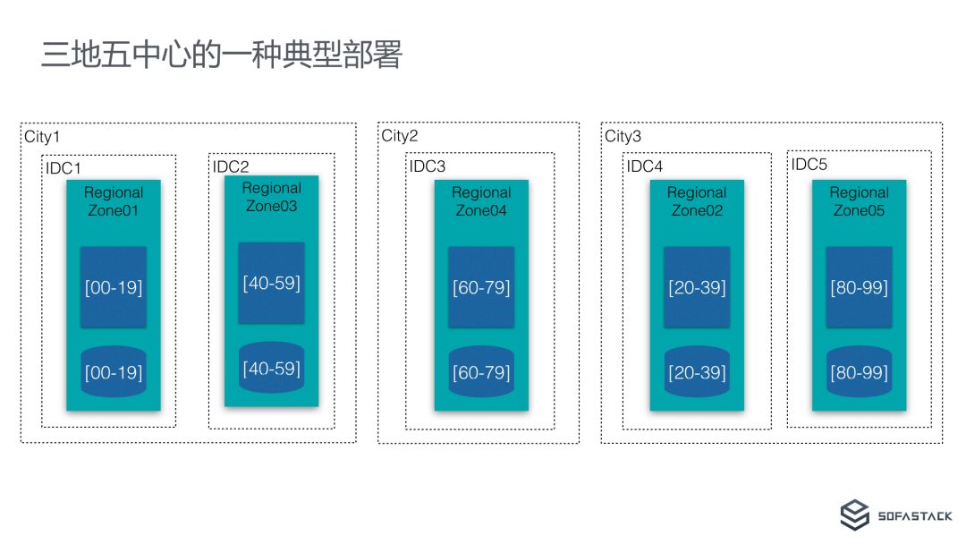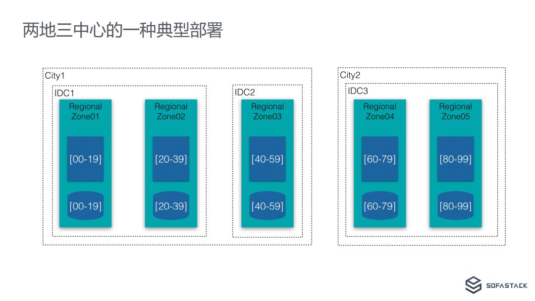 我们把单元叫做 Regional Zone。例如,数据按 100 份分片,逻辑上分为 5 个 Regional Zone,每个承载 20 份数据分片的业务。初期可能是部署成两地三中心(允许多个单元位于同一个数据中心)。随着架构的发展,再整单元搬迁,演化成三地五中心,应用层无需感知物理层面的变化。