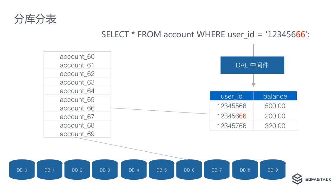 通过引入数据访问中间件,可以实现对应用透明的分库分表。一个比较好的实践是:逻辑拆分先一步到位,物理拆分慢慢进行。以账户表为例,将用户 ID 的末两位作为分片维度,可以在逻辑上将数据分成 100 份,一次性拆到 100 个分表中。这 100 个分表可以先位于同一个物理库中,随着系统的发展,逐步拆成 2 个、5 个、10 个,乃至 100 个物理库。数据访问中间件会屏蔽表与库的映射关系,应用层不必感知。
