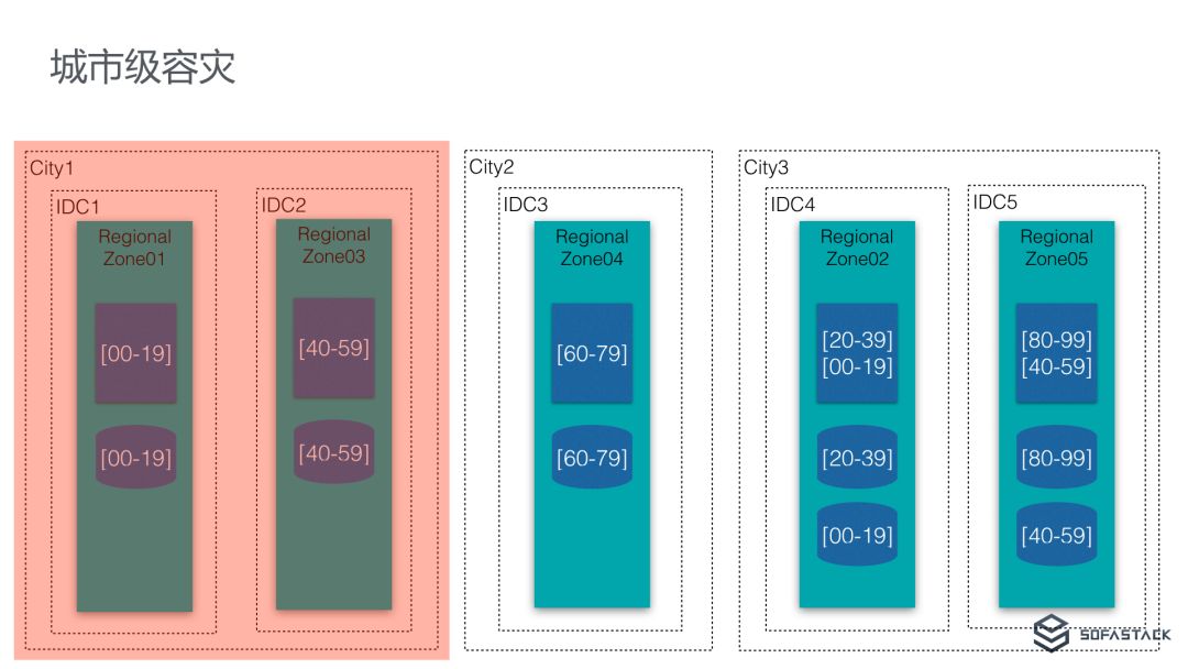 一个城市整体故障的情况下,应用层流量通过规则的切换,由事先规划好的其他单元接管。
