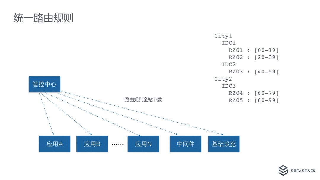 这么多的组件要协同工作,必须共享同一份规则配置信息。必须有一个全局的单元化规则管控中心来管理,并通过一个高效的配置中心下发到分布式环境中的所有节点。
