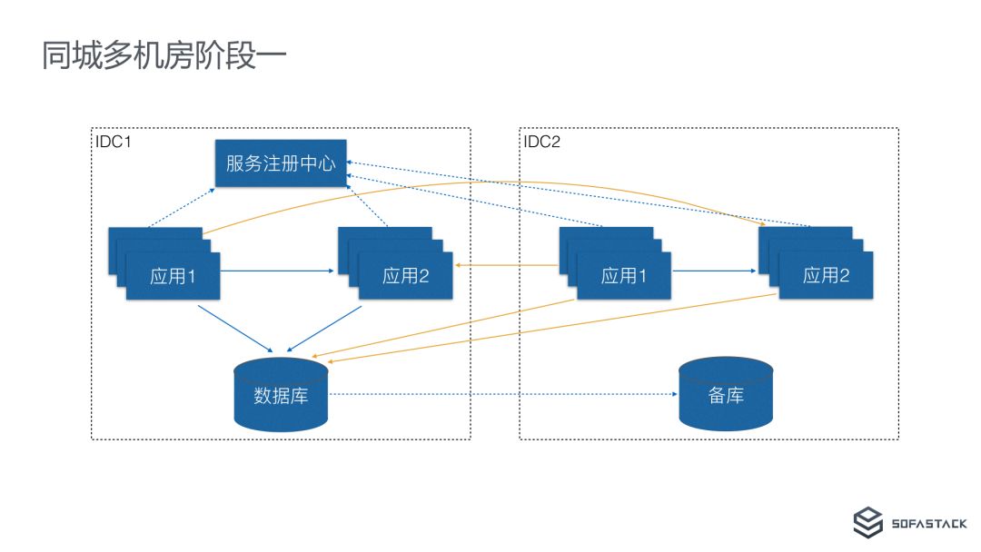 这一阶段,只是解决了机房容量不足的问题,两个机房逻辑上仍是一个整体。日常会存在两部分跨机房调用: