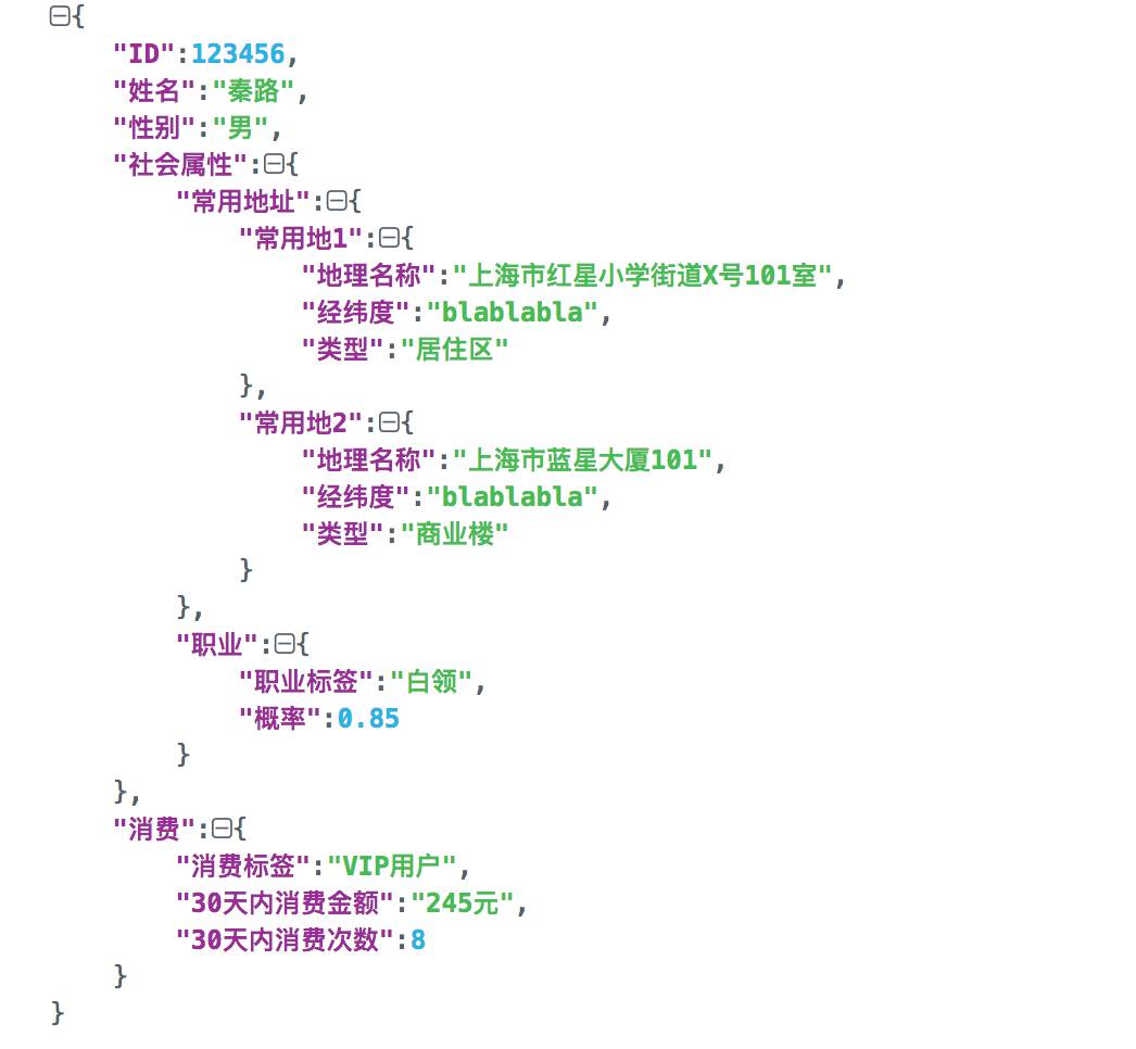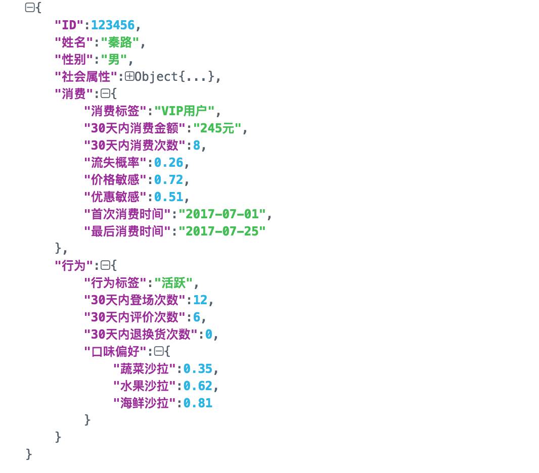 为了便于大家理解,我用JSON格式表示一个简易的用户画像。