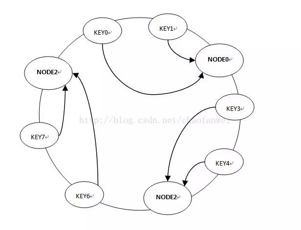一致性hash算法通过一个叫做一致性Hash环的数据结构实现KEY到缓存服务器的Hash映射,如下图: