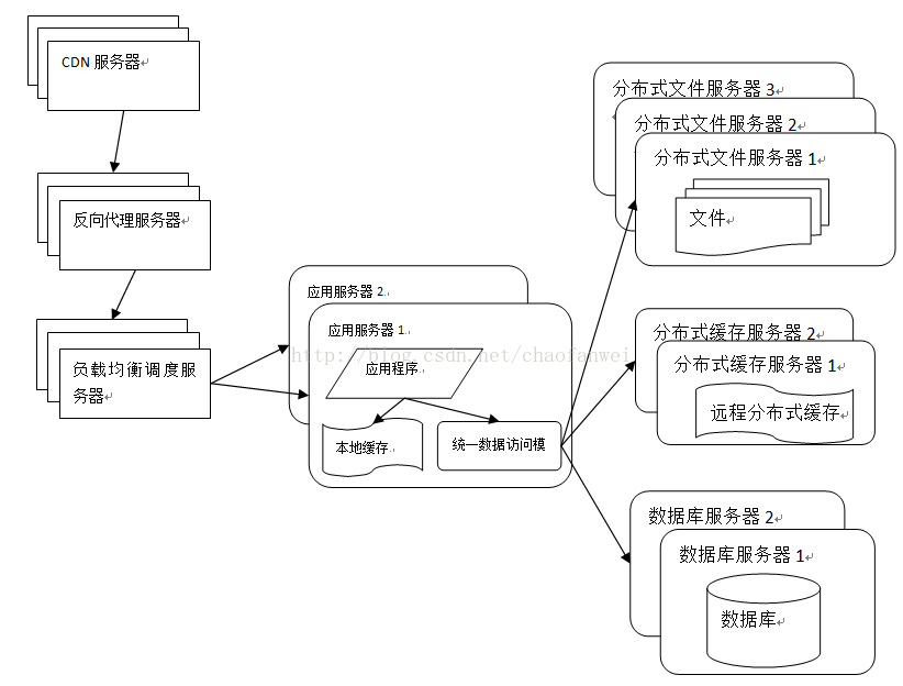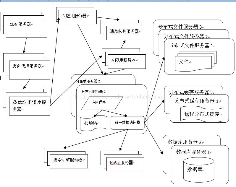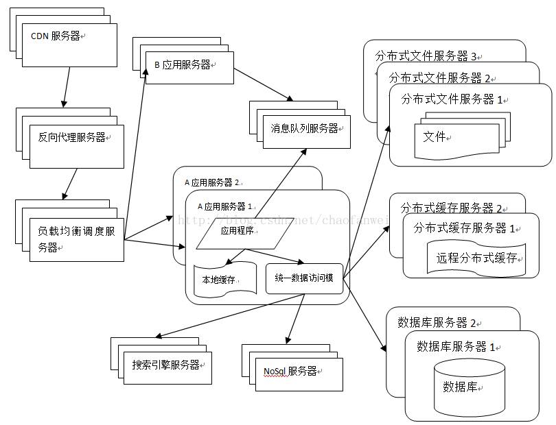分布式应用和服务:将分层和分隔后的应用和服务模块分布式部署,可以改善网站性能和并发性、加快开发和发布速度、减少数据库连接资源消耗。