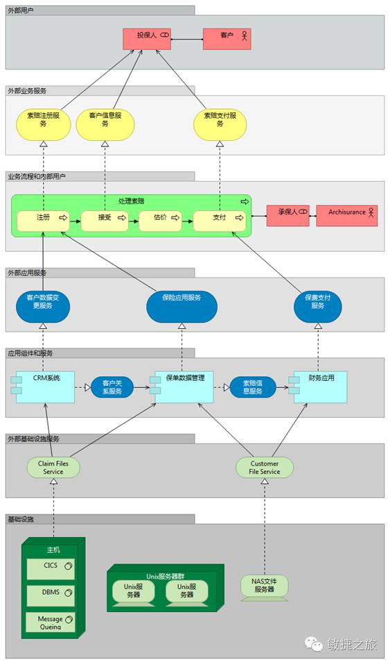 我们以某保险公司为例,看看使用ArchiMate做出的一个分层视图: