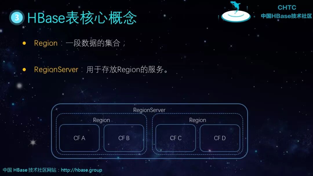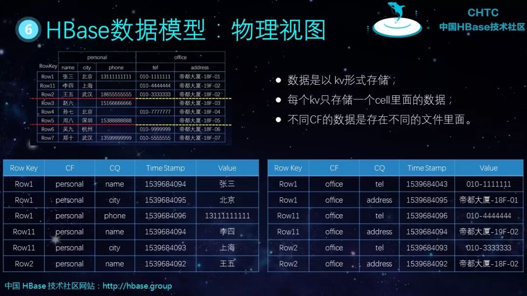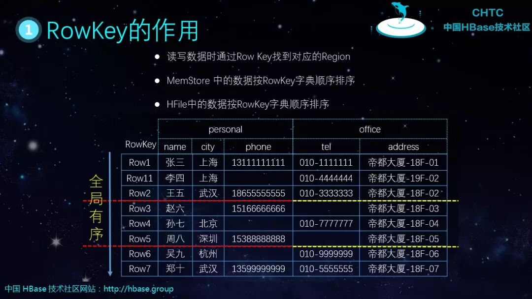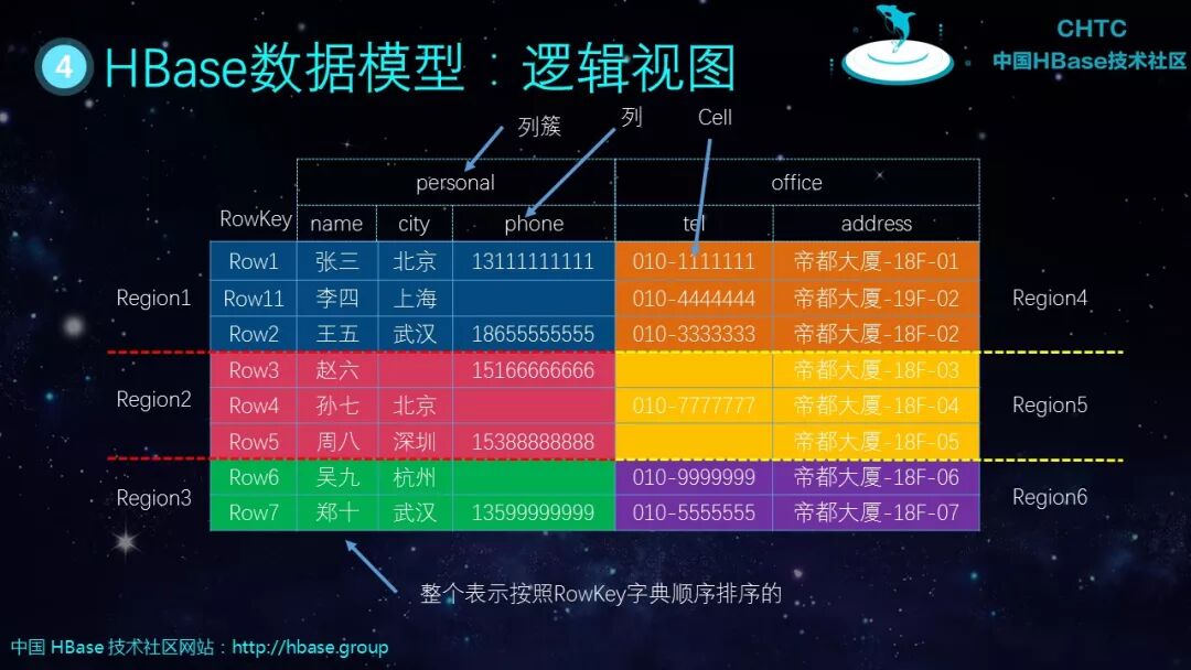从上图大家可以明显看出,这张表有两个 Column Family ,分别为 personal 和 office。而 personal 又有三列name、city 以及 phone;office 有两列 tel 以及 address。由于存储在 HBase 里面的表一般有上亿行,所以 HBase 表会对整个数据按照 RowKey 进行字典排序,然后再对这张表进行横向切割。切割出来的数据是存储在 Region 里面,而不同的 Column Family 虽然属于一行,但是其在底层存储是放在不同的 Region 里。所以这张表我用了六种颜色表示,也就是说,这张表的数据会被放在六个 Region 里面的,这就可以把数据尽可能的分散到整个集群。