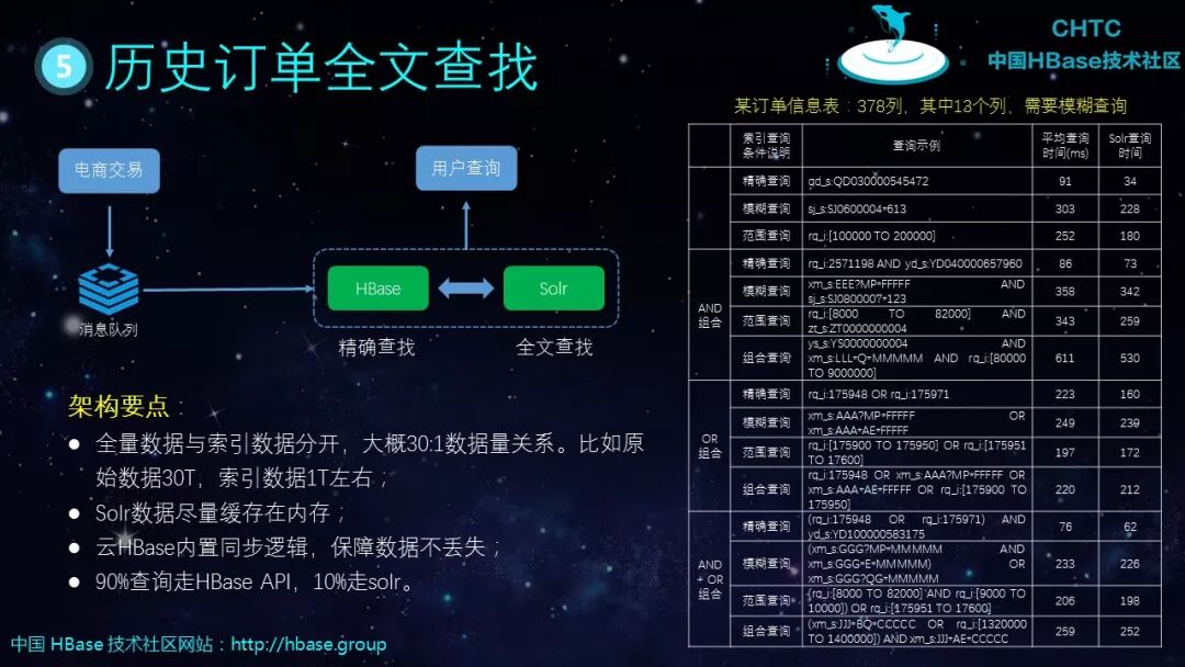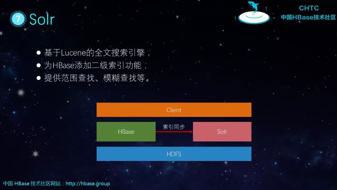 Solr:原生的 HBase 只提供了 Rowkey 单主键,如果我们需要对 Rowkey 之外的列进行查找,这时候就会有问题。幸好我们可以使用 Solr 来建立二级索引/全文索引充分满足我们的查询需求。
