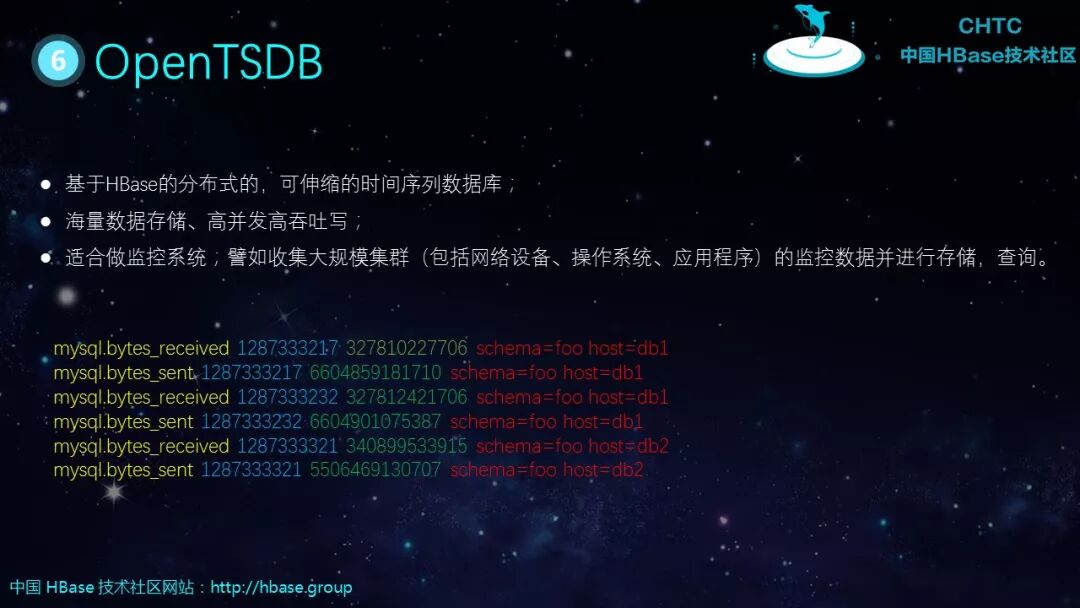OpenTSDB:基于HBase的分布式的,可伸缩的时间序列数据库。适合做监控系统;譬如收集大规模集群(包括网络设备、操作系统、应用程序)的监控数据并进行存储,查询。