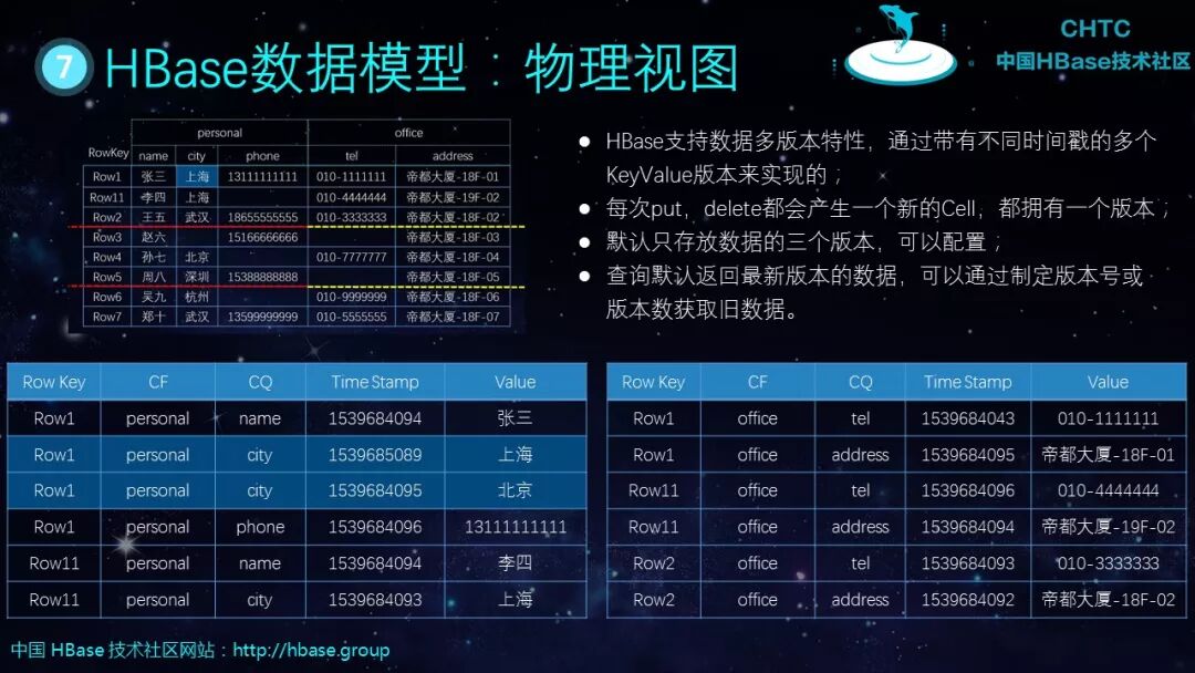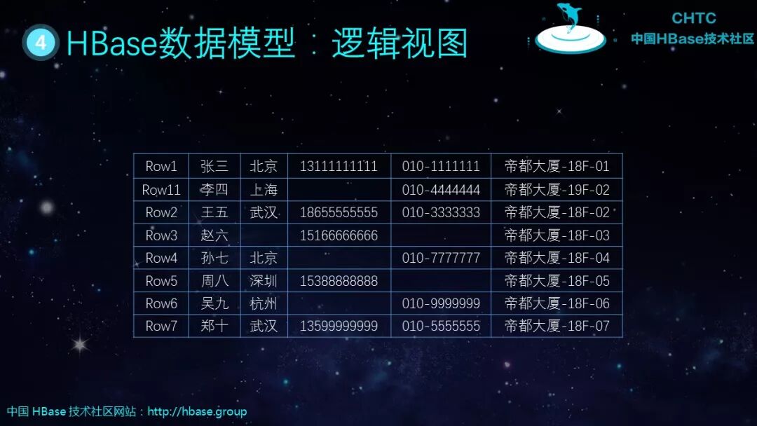 大家可以从上面的 kv 表现形式看出,Row11 的 phone 这列其实是没有数据的,在 HBase 的底层存储里面也就没有存储这列了,这点和我们传统的关系型数据库有很大的区别,有了这个特点, HBase 特别适合存储稀疏表。