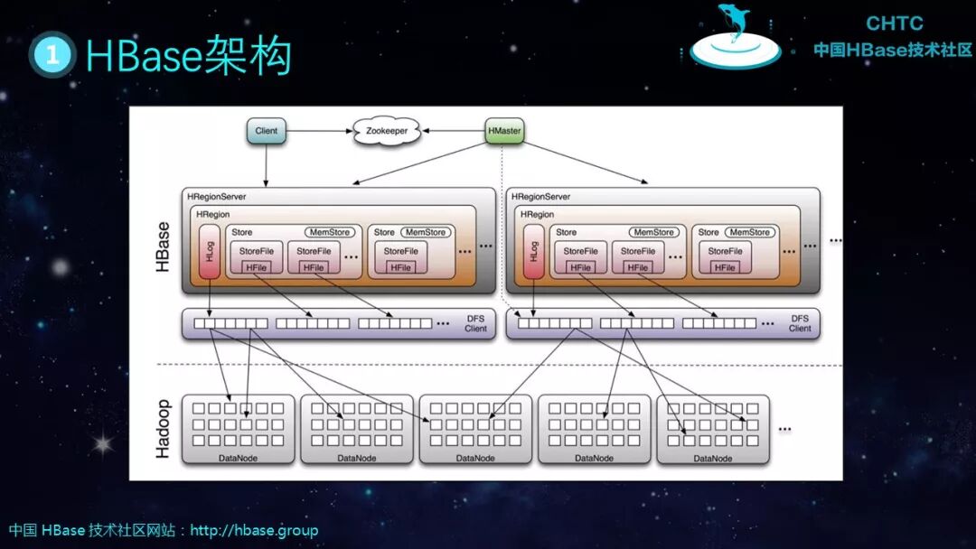 到这里我们已经了解了 HBase 表及其底层的 KV 存储了,现在让我们来了解一下 HBase 是如何读写数据的。首先我们来看看 HBase 的架构设计,这种图来自于社区: