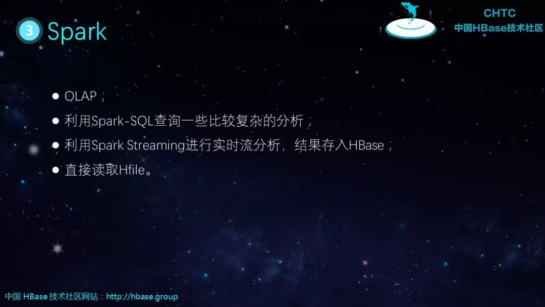 Spark:我们可以使用 Spark 进行 OLAP 分析;也可以使用 Spark SQL 来满足比较复杂的 SQL 查询场景;使用 Spark Streaming 来进行实时流分析。