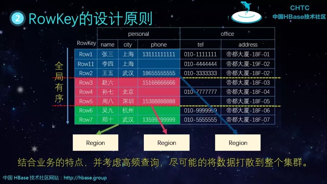 从下图可以看到,底层的 HFile 最终是按照 Rowkey 进行切分的,所以我们的设计原则是结合业务的特点,并考虑高频查询,尽可能的将数据打散到整个集群。