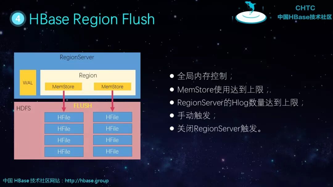既然我们写数都是先写 WAL,再写 MemStore ,而 MemStore 是内存结构,所以 MemStore 总会写满的,将 MemStore 的数据从内存刷写到磁盘的操作成为 flush: