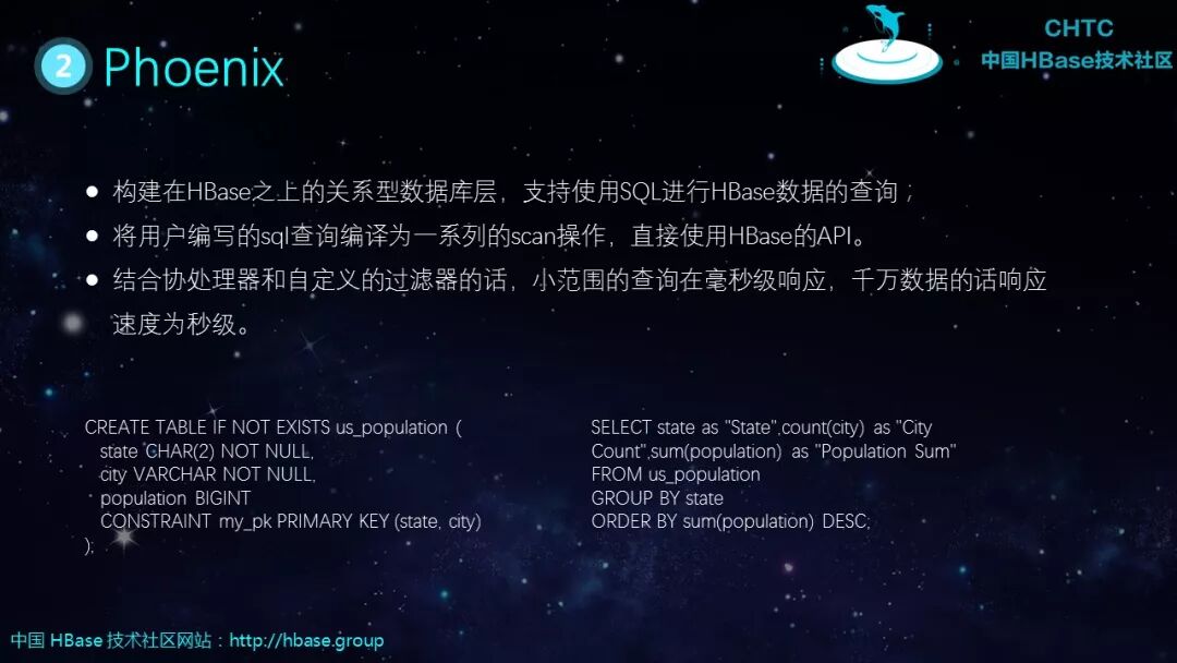 Phoenix:主要提供使用 SQL 的方式来查询 HBase 里面的数据。一般能够在毫秒级别返回,比较适合 OLTP 场景。