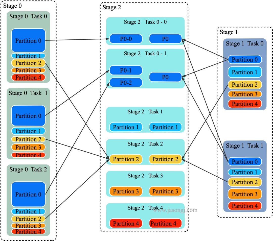 Stage 2 启动 5 个 Task 分别去 Stage 0 与 Stage 1 中所有包含 Partition 分区数据的 Task 中取对应 Partition 的数据。(如果某个 Mapper 不包含该 Partition 的数据,则 Redcuer 无须向其发起读取请求);