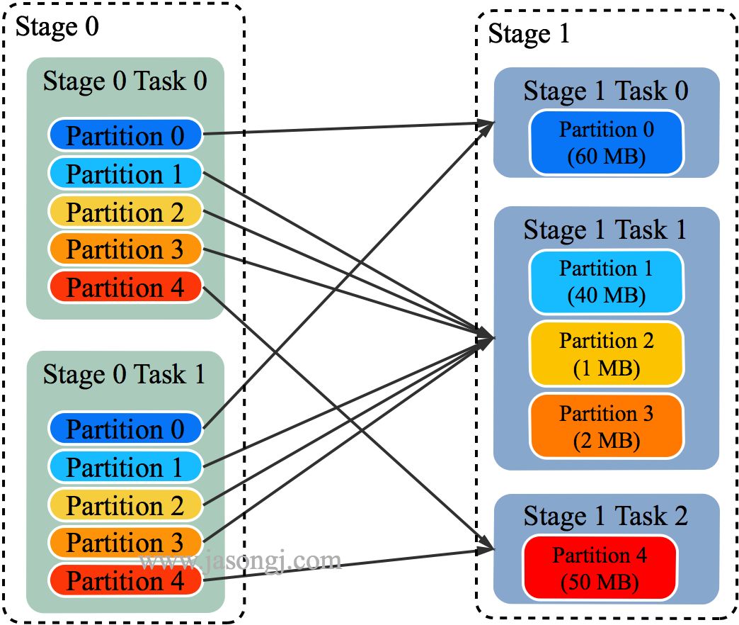 对于 Partition 0 的处理,有点类似于 BroadcastJoin 的做法。但区别在于,Stage 2 的 Task 0-0 与 Task 0-1 同时获取 Stage 1 中属于 Partition 0 的全量数据,是通过正常的 Shuffle Read 机制实现,而非 BroadcastJoin 中的变量广播实现。