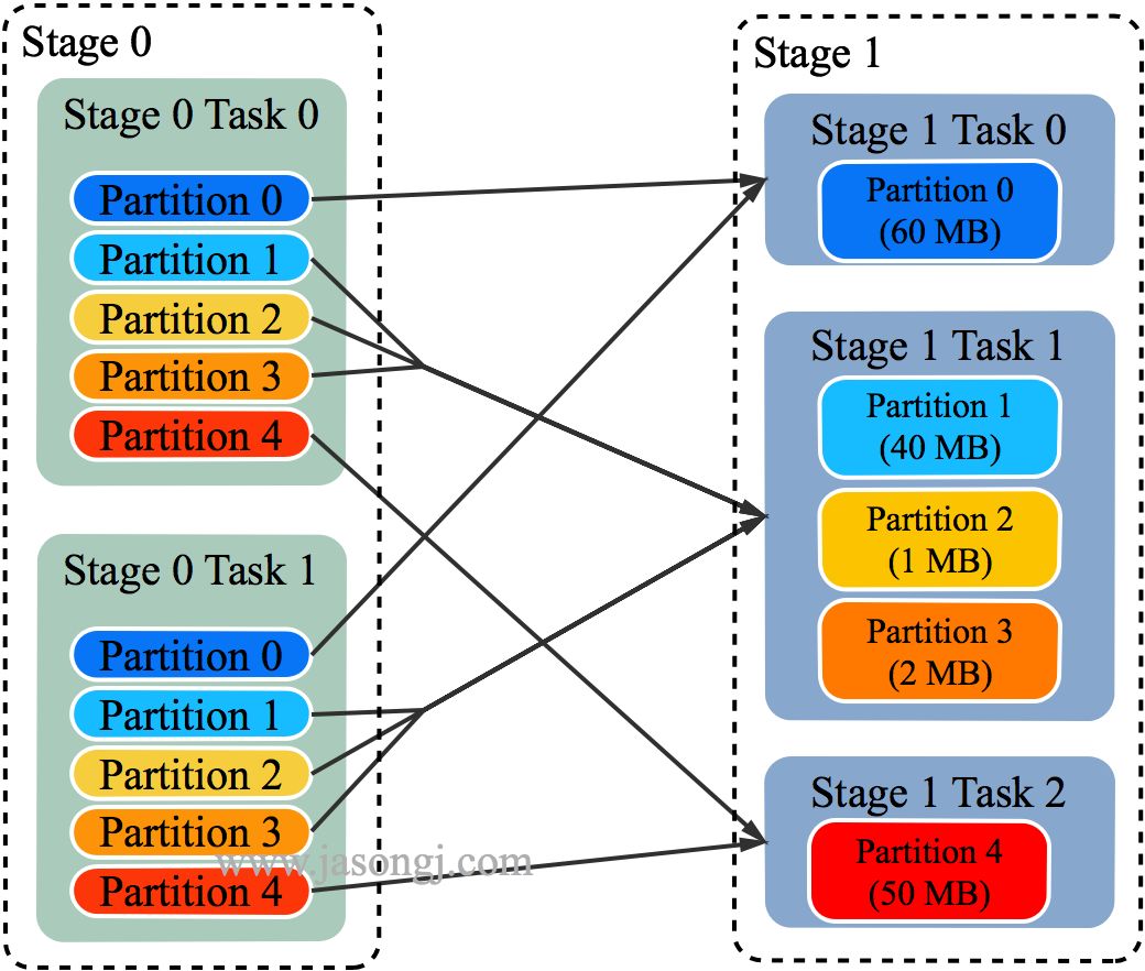 如 Spark Shuffle 原理 一节图中所示,Stage 1 的 5 个 Partition 数据量分别为 60MB,40MB,1MB,2MB,50MB。其中 1MB 与 2MB 的 Partition 明显过小(实际场景中,部分小 Partition 只有几十 KB 及至几十字节)。