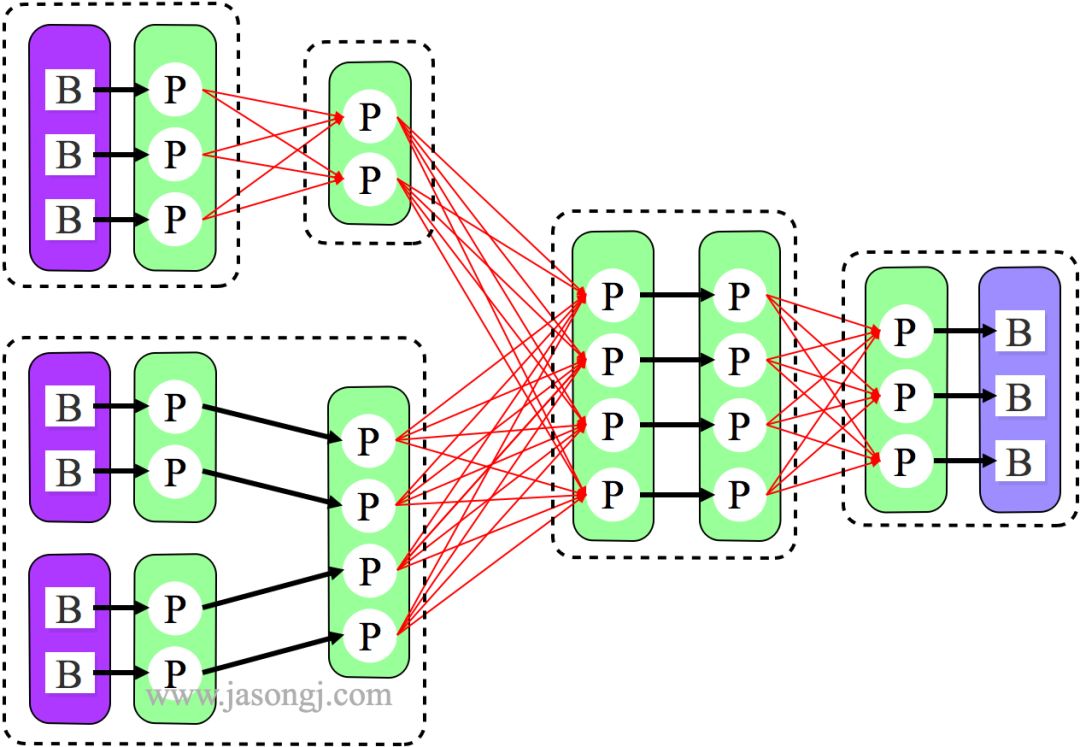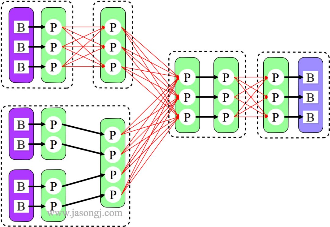 在上图中,左右两边分别是参与 Join 的 Stage 0 与 Stage 1 (实际应该是两个 RDD 进行 Join,但如同上文所述,这里不区分 RDD 与 Stage),中间是获取 Join 结果的 Stage 2。