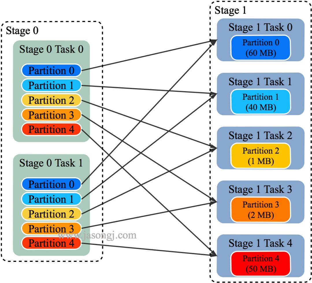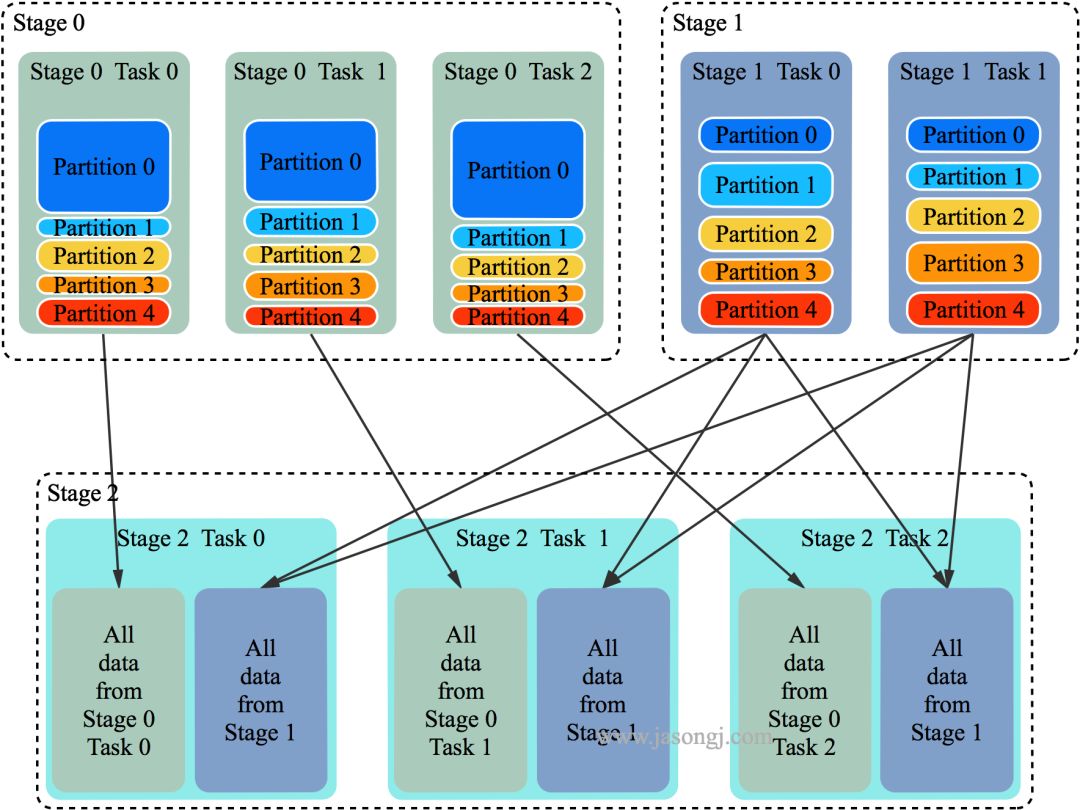 Task 0-0 与 Task 0-1 都从 Stage 1 的两个 Task 中所有属于 Partition 0 的数据