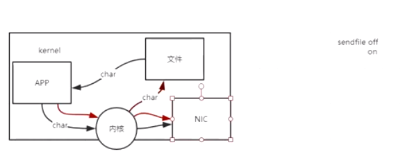sendfile:off 需要把文件读到应用程序里内存里,在发送给内核,内核发出去。两次复制操作 性能低