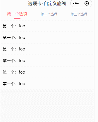 Page({ data: { currentIndex: 0, firstList: ['foo', 'foo', 'foo', 'foo', 'foo', 'foo'], secondList: ['bar', 'bar', 'bar', 'bar', 'bar', 'bar', 'bar', 'bar'] }, //用户点击tab时调用 titleClick: function (e) { this.setData({ //拿到当前索引并动态改变 currentIndex: e.currentTarget.dataset.idx }) }, //swiper切换时会调用 pageChange: function (e) { if ('touch' === e.detail.source) { let currentPageIndex = this.data.currentIndex currentPageIndex = (currentPageIndex + 1) % 2 this.setData({ currentIndex: currentPageIndex }) } } })