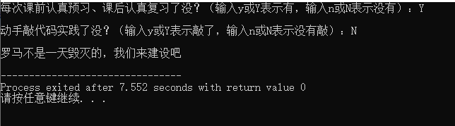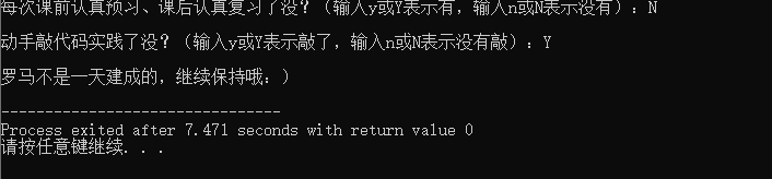 5 printf("每次课前认真预习、课后认真复习了没?(输入y或Y表示有,输入n或N表示没有):");