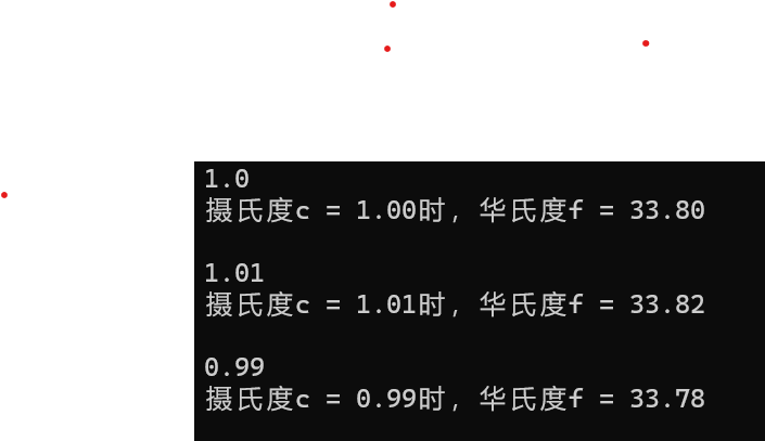 8 printf("摄氏度c = %.2f时,华氏度f = %.2f\n",c,f);