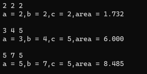 10 printf("a = %d,b = %d,c = %d,area = %.3f\n",a,b,c,area);