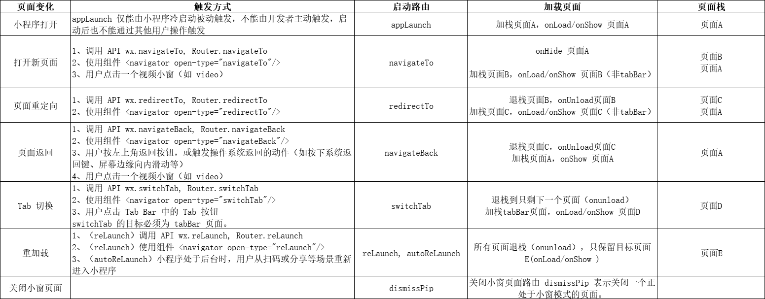 页面创建: 创建新页面、压入页面栈、挂载页面、onLoad、onShow (前:wx.onBeforePageLoad;后:wx.onAfterPageLoad)