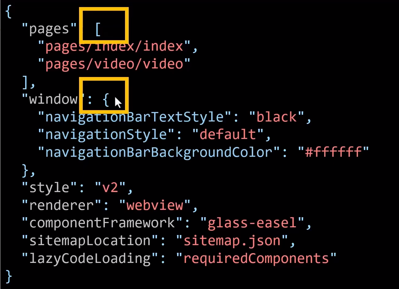 可配置window(状态栏/导航栏/窗口)/pages(页面)/tabBar(底部导航栏)等内容。