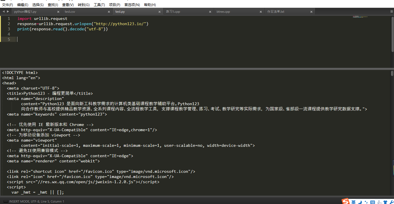 1 import urllib.request 2 response=urllib.request.urlopen("http://python123.io/") 3 print(response.read().decode("utf-8"))