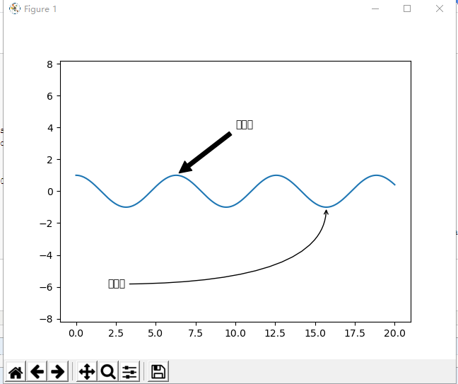 ax.annotate('最大值',xy = (6.28,1),xytext = (10,4),arrowprops = dict(facecolor = 'black',shrink = 0.05))