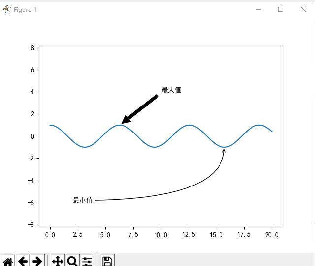ax.annotate('最小值',xy = (5*np.pi,-1),xytext=(2,-6),arrowprops = dict(arrowstyle = "->",connectionstyle ="angle3,angleA = 0,angleB=-90" ))