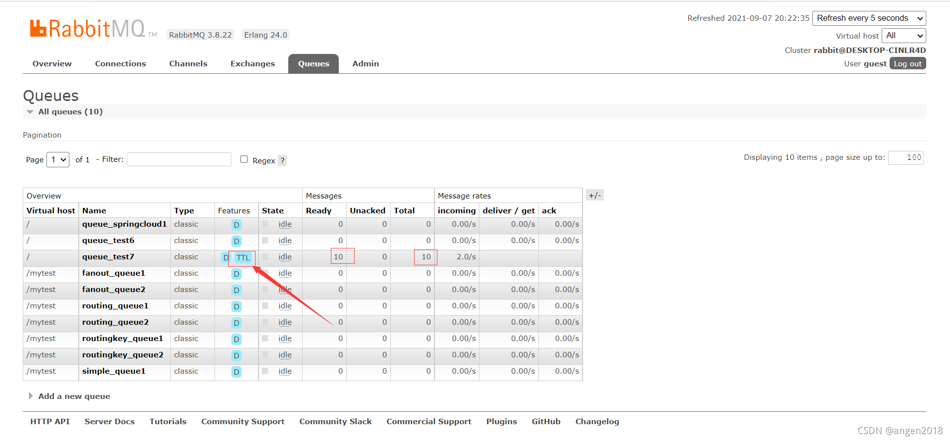 TTL(Time to live存活时间)标识消息过期时间:消费如果在存活时间到的时候还未被消费就会被自动清理