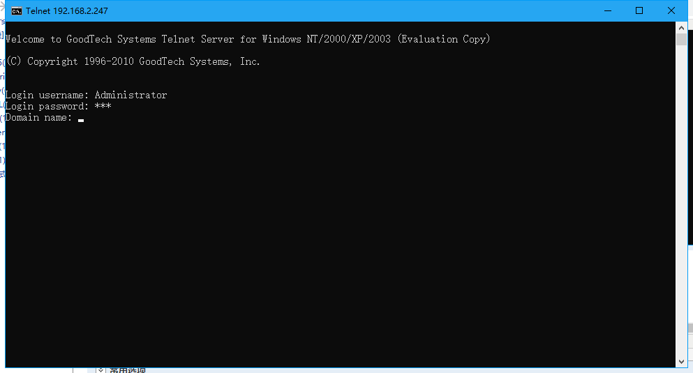 3.回车,进入telnet 服务页面,然后输入“账号”,“密码”,“域名”(不知道这是啥,我得是为空)