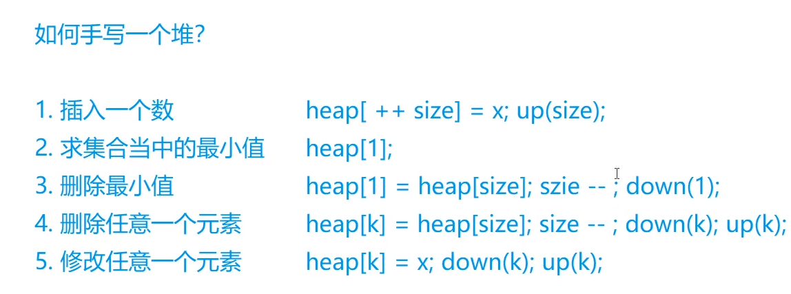 #include<iostream> #include<algorithm> #include<string.h> using namespace std; const int N = 100010; int h[N]; int hp[N], ph[N]; int n; int siz ; void swap_heap(int a,int b) { swap(ph[hp[a]], ph[hp[b]]); swap(hp[a], hp[b]); swap(h[a],h[b]); } void up(int u) { while (u / 2 && h[u / 2] > h[u]) { swap_heap(u, u / 2); u /= 2; } } void down(int u) { int t = u; if (h[u * 2] < h[t] && u * 2 <= siz) t = u * 2;//注意这段代码 if (h[u * 2 + 1] < h[t] && u * 2 + 1 <= siz) t = u * 2 + 1; if (t != u) { swap_heap(u,t); down(t); } } int main() { cin >> n; int idx=0; while (n--) { char op[5]; scanf("%s", op);int k,x; if (!strcmp(op, "I")) { scanf("%d", &x); siz++;idx++; ph[idx] = siz; hp[siz] = idx; h[siz] = x; up(siz); } else if (!strcmp(op, "PM")) printf("%d\n", h[1]); else if (!strcmp(op, "D")) { scanf("%d", &k); k = ph[k]; swap_heap(k, siz); siz--; up(k); down(k); } else if(!strcmp(op, "DM")){ swap_heap(1,siz); siz--; down(1); } else{ scanf("%d%d", &k, &x); k = ph[k]; h[k] = x; up(k); down(k); } } return 0; }