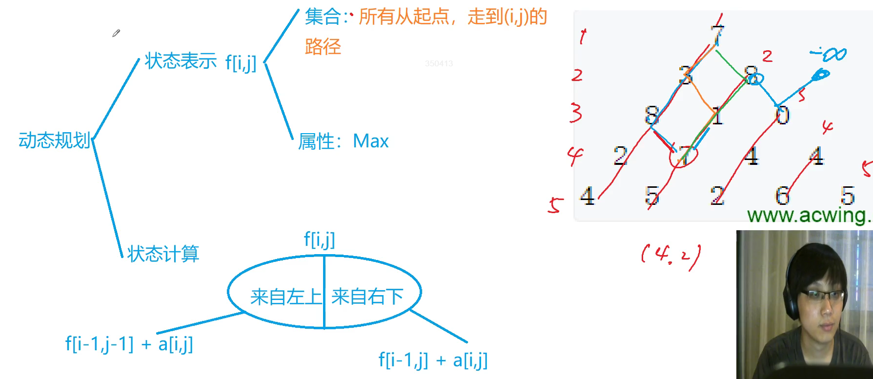 #include<iostream> #include<cstring> #include<algorithm> using namespace std; const int N=510,INF=1e9; int n;int a[N][N],p[N][N]; int main() { cin>>n; for(int i=1;i<=n;i++) for(int j=1;j<=i;j++) cin>>a[i][j]; //初始化,便于后面更新 memset(p,-0x3f3f3f3f,sizeof p); //切记头一个初始化 p[1][1]=a[1][1]; for(int i=2;i<=n;i++) for(int j=1;j<=i;j++) p[i][j]=max(p[i-1][j-1]+a[i][j],p[i-1][j]+a[i][j]); //最大值在最后一排,但不一定是最后一个,需要求解 int res=-INF; for(int i=1;i<=n;i++) res=max(res,p[n][i]); cout<<res<<endl; return 0; }