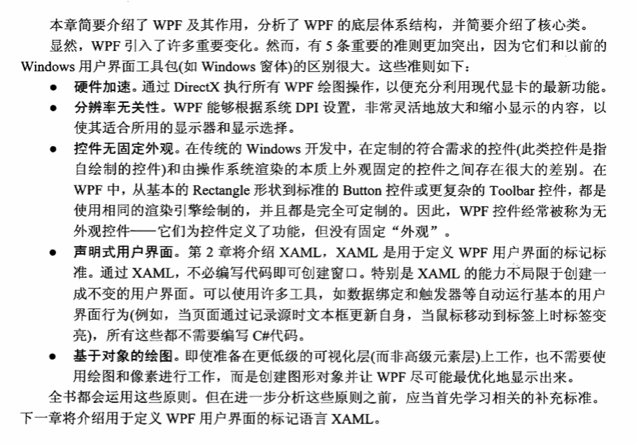 WPF窗口中显示的每个元素本质上都是Visual对象。可以该类视为绘图对象,其中封装了绘图指令、如何执行绘图的附加细节,如透明度、裁剪以及变换位置,以及基本功能(命中测试);该类还在托管的WPF库和渲染桌面的milcore.dll程序及之间提供了链接,任何继承自该类的类都能在窗口上显示出来。因此,可以直接对该类进行编程也可以创建轻量级的用户界面。