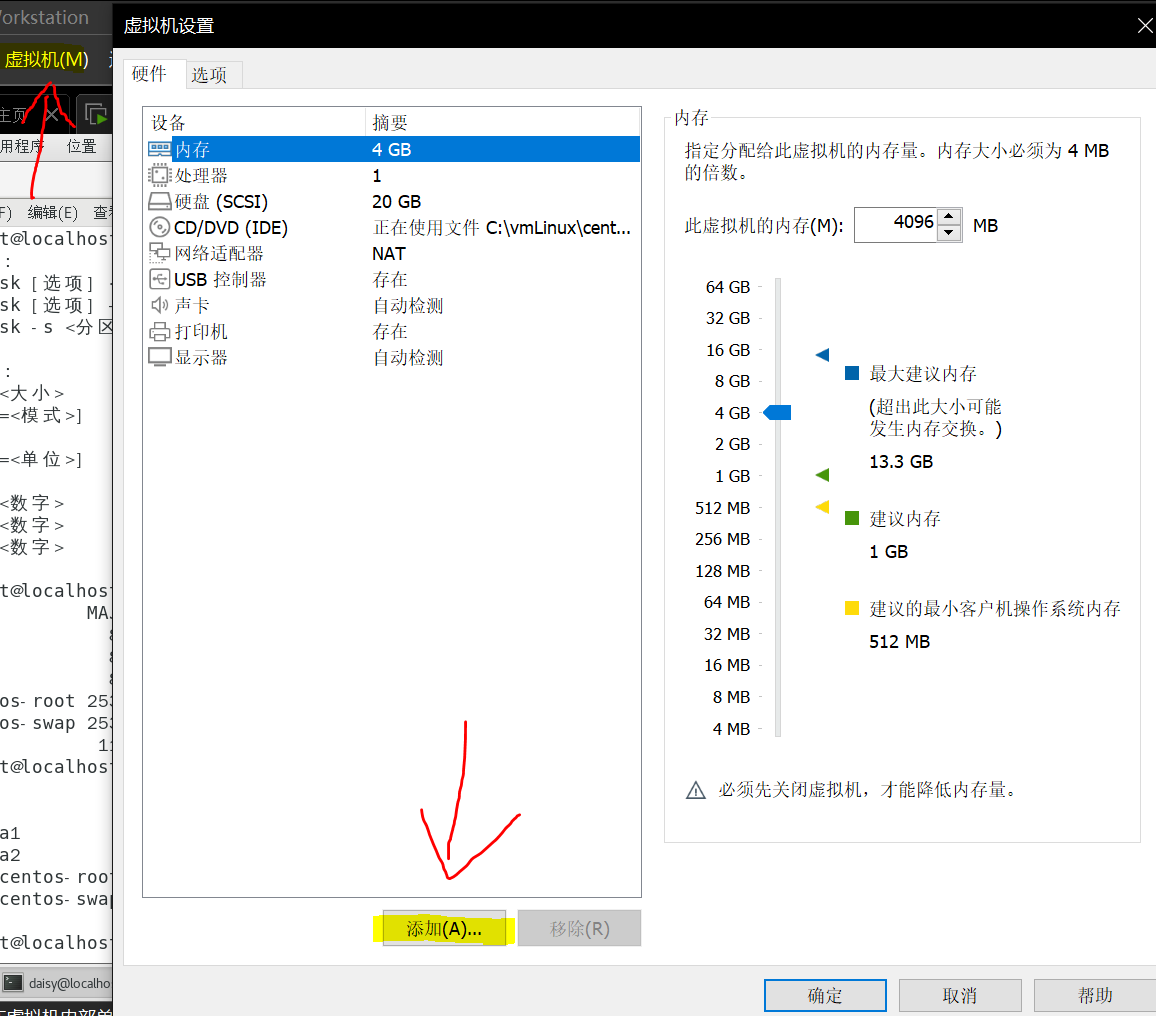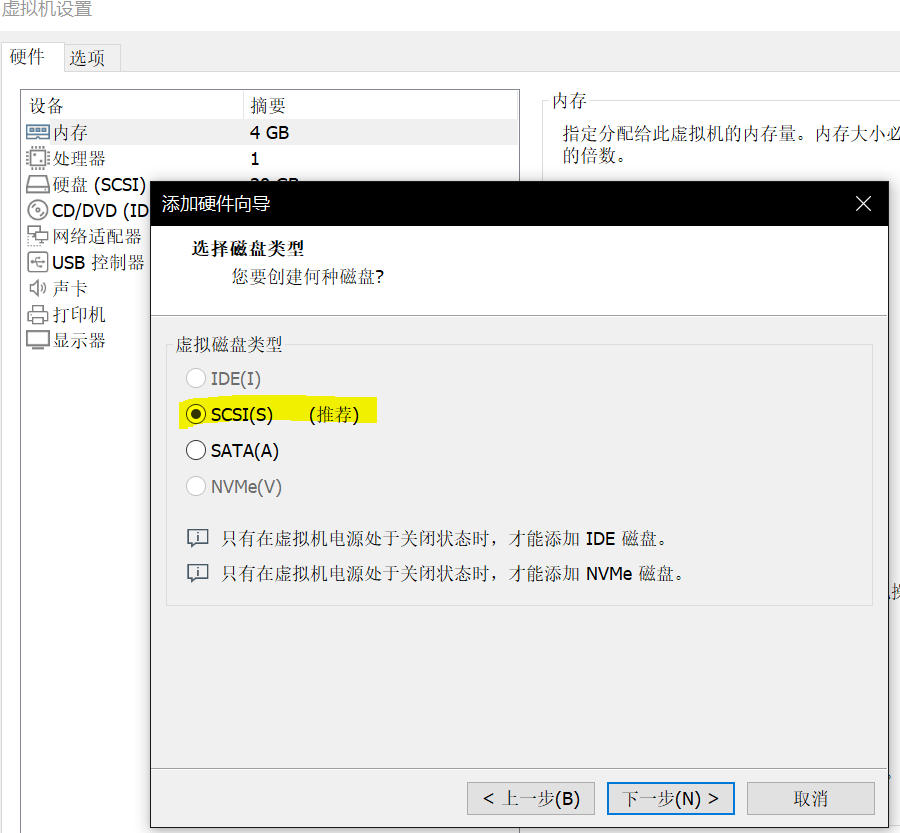 - 添加硬盘(先进入虚拟机设置,直接添加下一步)