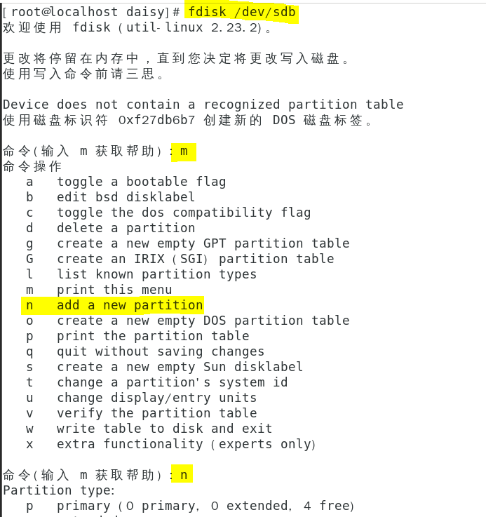 - fdiks /dev/sdb:开始对sdb分区进行分区