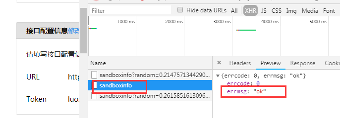 遇到这种情况的时候,不要着急,首先打开你的控制台,在配置保存的时候腾讯会往你填写的URL发送请求,校验填写的token和本地的token以及其它参数是否匹配,如果校验通过会返回如下截图,如果校验不通过,则会把提示信息以及对应的code返回来,根据提示信息,找解决方案就容易了。