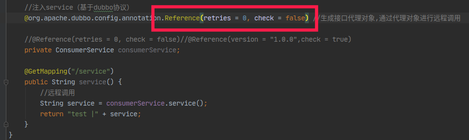 @org.apache.dubbo.config.annotation.Reference(retries = 0, check = false) //生成接口代理对象,通过代理对象进行远程调用
