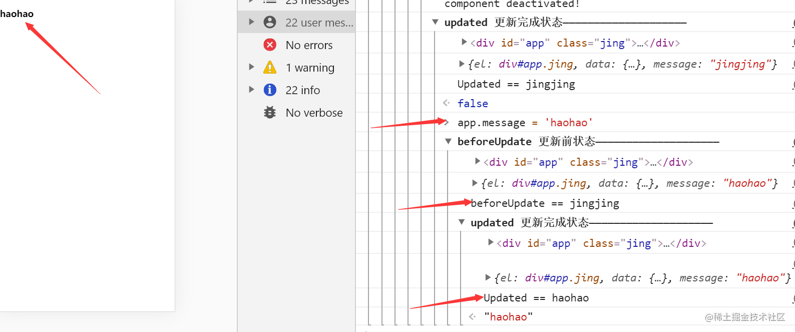 beforeUpdate和updated触发时,el中的数据都已经渲染完成,但根据控制台打印的信息beforeUpdate = jingjing而updated = haohao可知,只有当updated钩子被调用时候,组件dom才会被更新。